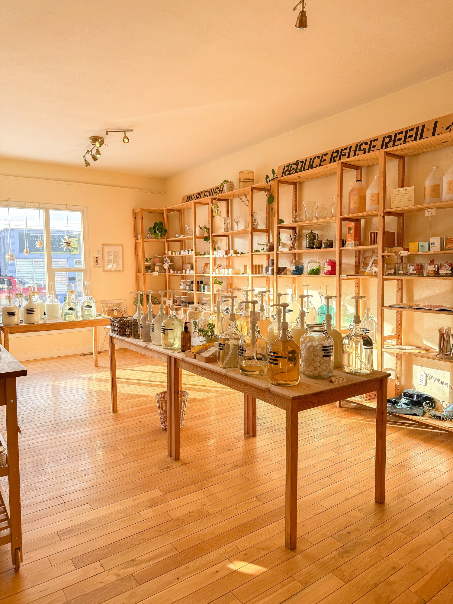 We have a wide variety of biodegradable, sulphate/phthalate free, and Canadian refillable products including our house brand of hand soap, dish soap, all purpose cleaners, laundry soap, and shower gels - made right here in Edmonton!