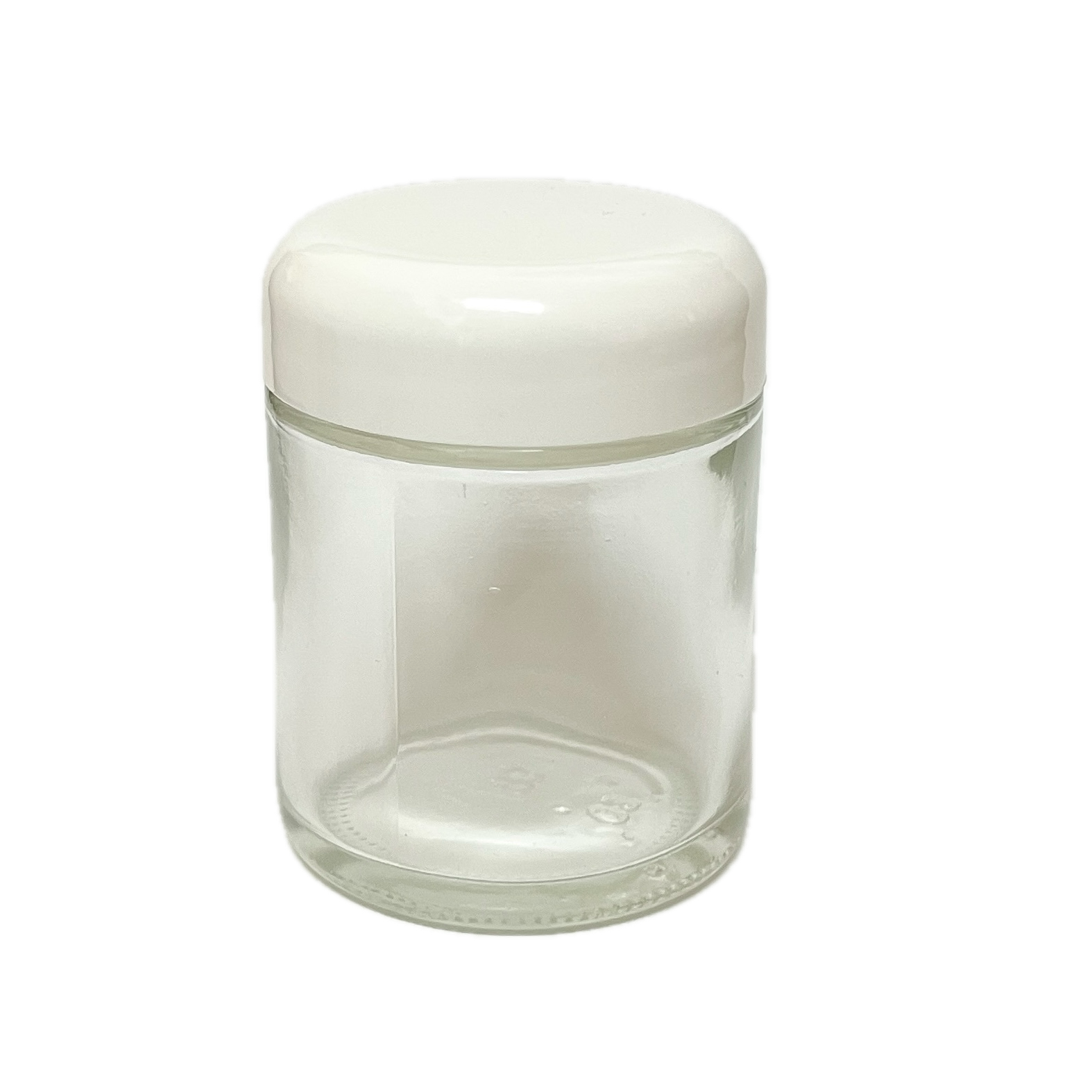 Clear glass jar with white plastic lid.