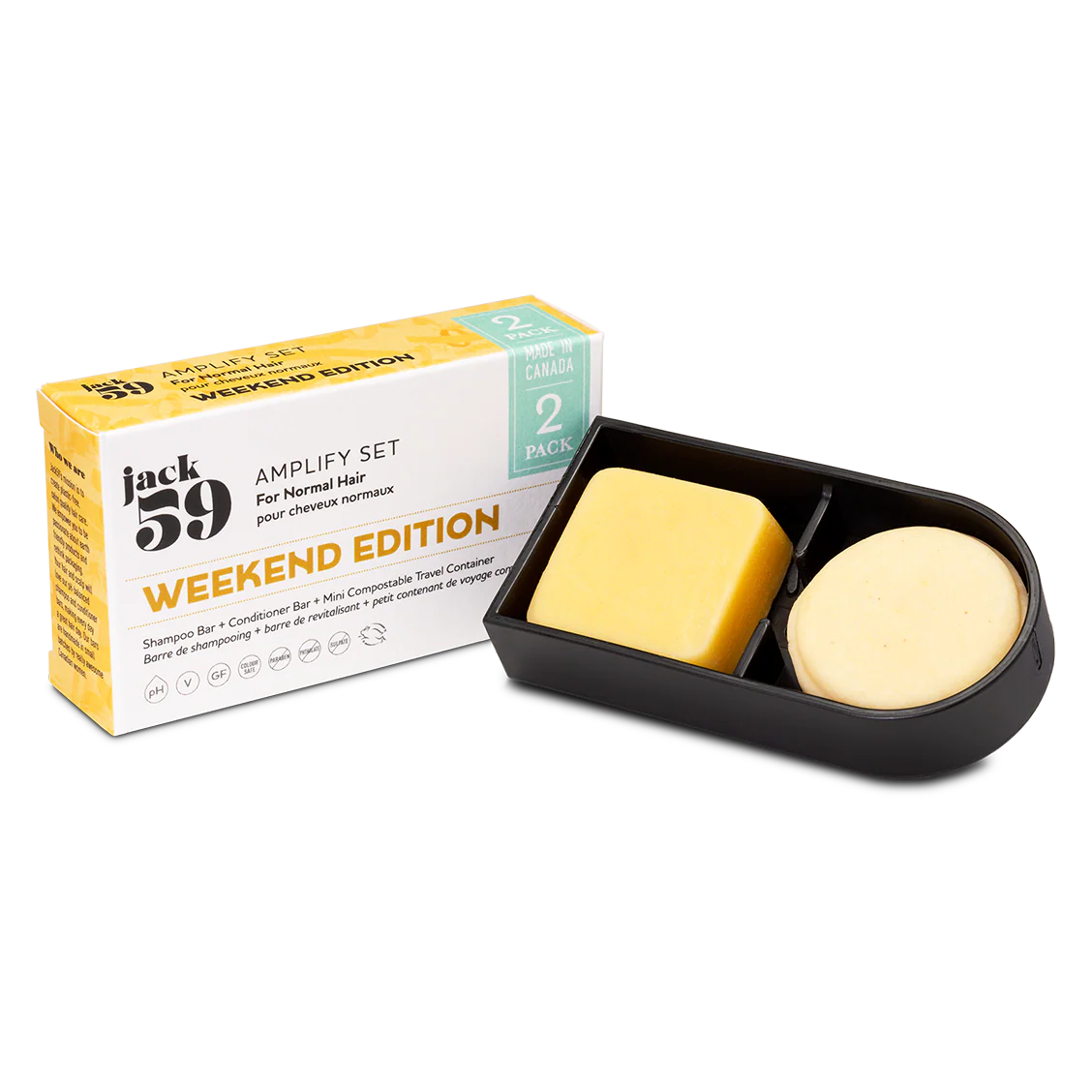 Each Weekend Edition Travel Set includes a mini Shampoo Bar (circle) and Conditioner Bar (square) for a complete hair care experience, plus a Mini Compostable Shower Container. This travel size shampoo and conditioner set is TSA-friendly and perfect for weekend getaways or business trips—compact, eco-friendly travel set that delivers salon-quality care wherever you roam.